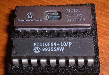 PIC16F84はEEPROM内蔵のため、電気的に消去が出来るので大変便利なPICです。(写真下側)寿命が来るまで何度もプログラムを書き換えできるため、アマチュアの使用に適しています。 しかし、A/D変換付きのPICなどを使いたくなった場合、ワンタイムROMしかないので、一度しか書き込むことができませんが、開発用に便利な窓付きのPICがあります。(写真上側。)品番に/JWと付いているものがそうです。 通常の5倍ぐらいの値段がします。 これらは紫外線を照射することにより消去することが出来ます。今回はそのROM消去器の作成です。 |