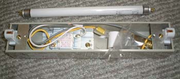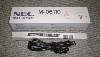箱の中は蛍光灯のセットです。ROMイレーサセットというわりには普通の蛍光灯も入ってます。あとはグロー球など必要なものは一通り中の袋に入ってます。ACケーブルをつなぐだけで完成です。 |
