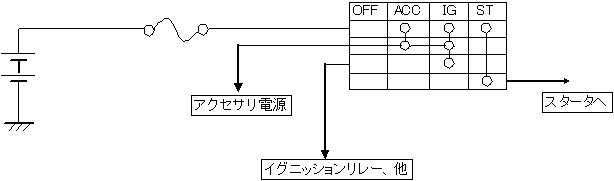 電源がバッテリーと直につながっています。キーをひねると、ポジションに応じて