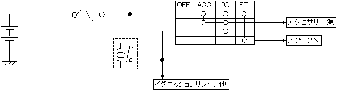 アクセサリ、イグニッションリレー、スタータなどに電源が供給されます。