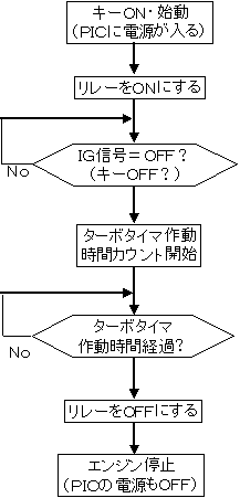 キーOFFを検出したら、ターボタイマの分だけ待ってからリレーをOFFにすれば目的が達成できます。