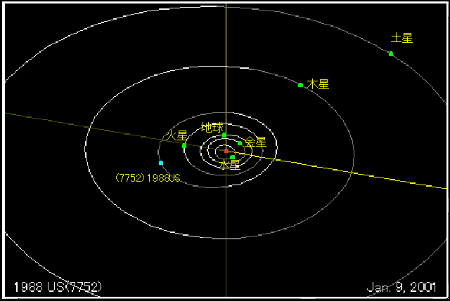 この軌道は1950年から2000年までの8回の観測期に49個の観測から求められた軌道である。現時点での最も新しい観測は2000年5月4日である。軌道の誤差は位置観測の平均残差で0.65″である。[図1]のように火星と木星の間を3.49年の周期でまわる軌道です。1月9日の惑星と(7752)の軌道上の位置を示します。